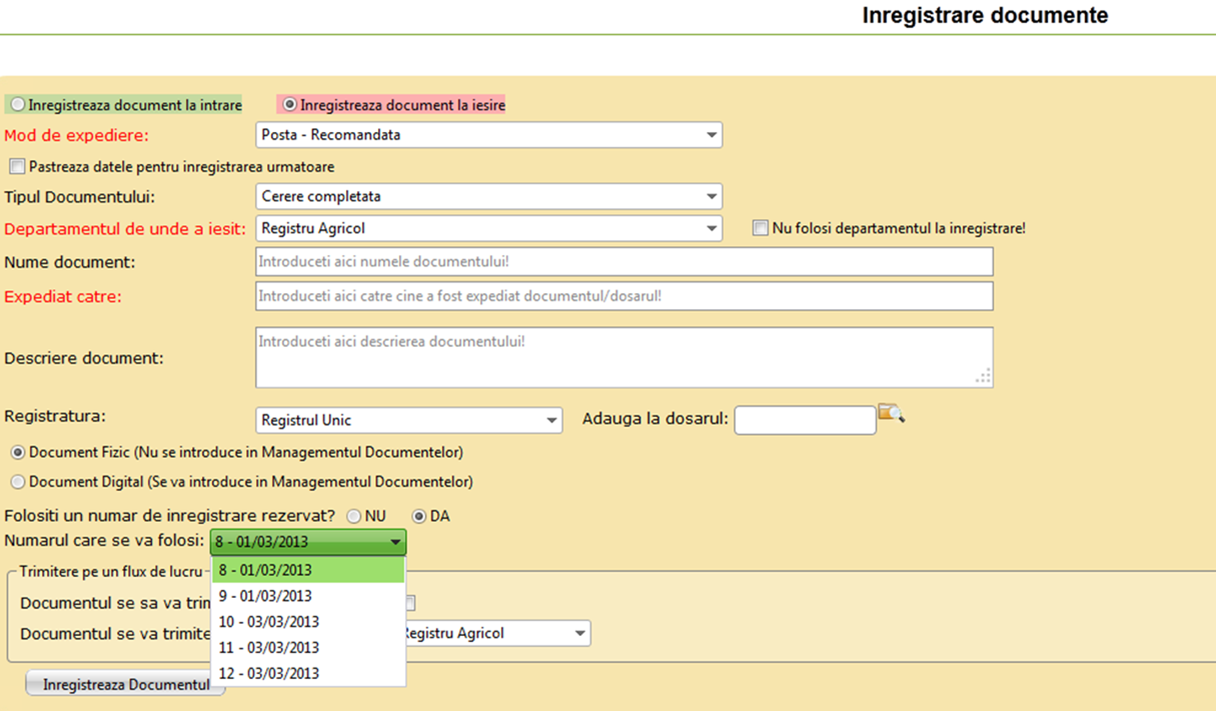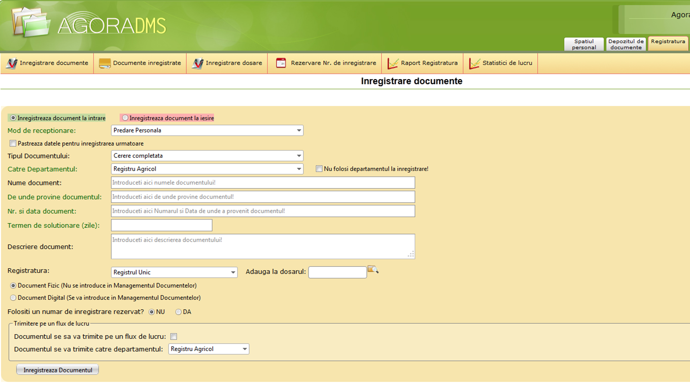 Înregistrarea documentelor se face foarte simplu, completând exact aceleași câmpuri pe care utilizatorii le-ar fi completat în formularul de pe hârtie. Mai mult, documentele pot fi trimise automat pe un flux de lucru și pot fi folosite ca task-uri pentru cei cărora se adresează.