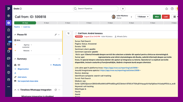Date avansate despre apeluri: Urmărește datele apelurilor, precum durata, sursa, campaniile, reclamele și cuvintele cheie PPC, pentru a înțelege mai bine comportamentul clienților.