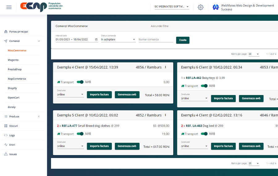 Integrari cu multe ERP-uri, in primul rand cele mai raspandite, cu platforme ecommerce, cu marketplace-uri, cu firme de curierat sau care ofera servicii integrate de logistica, servicii de fullfilment si dropshipping