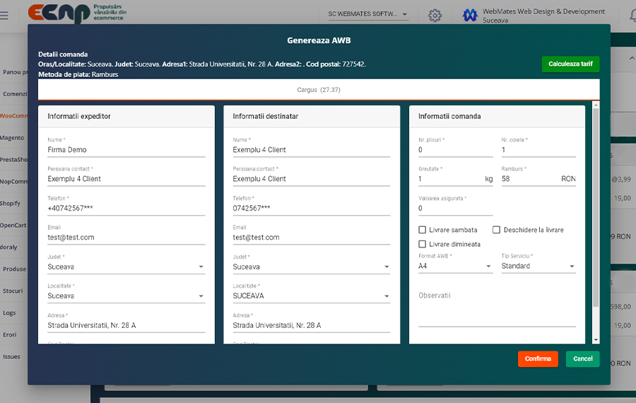 Trimiterea coletelor și generarea AWB-urilor se poate face acum direct din Syncap, indiferent câte firme de curierat partenere ai nevoie să incluzi în proces. În funcție de contractele semnate și de volumul negociat, poți urmări acum eficiența procesului direct din aplicație.