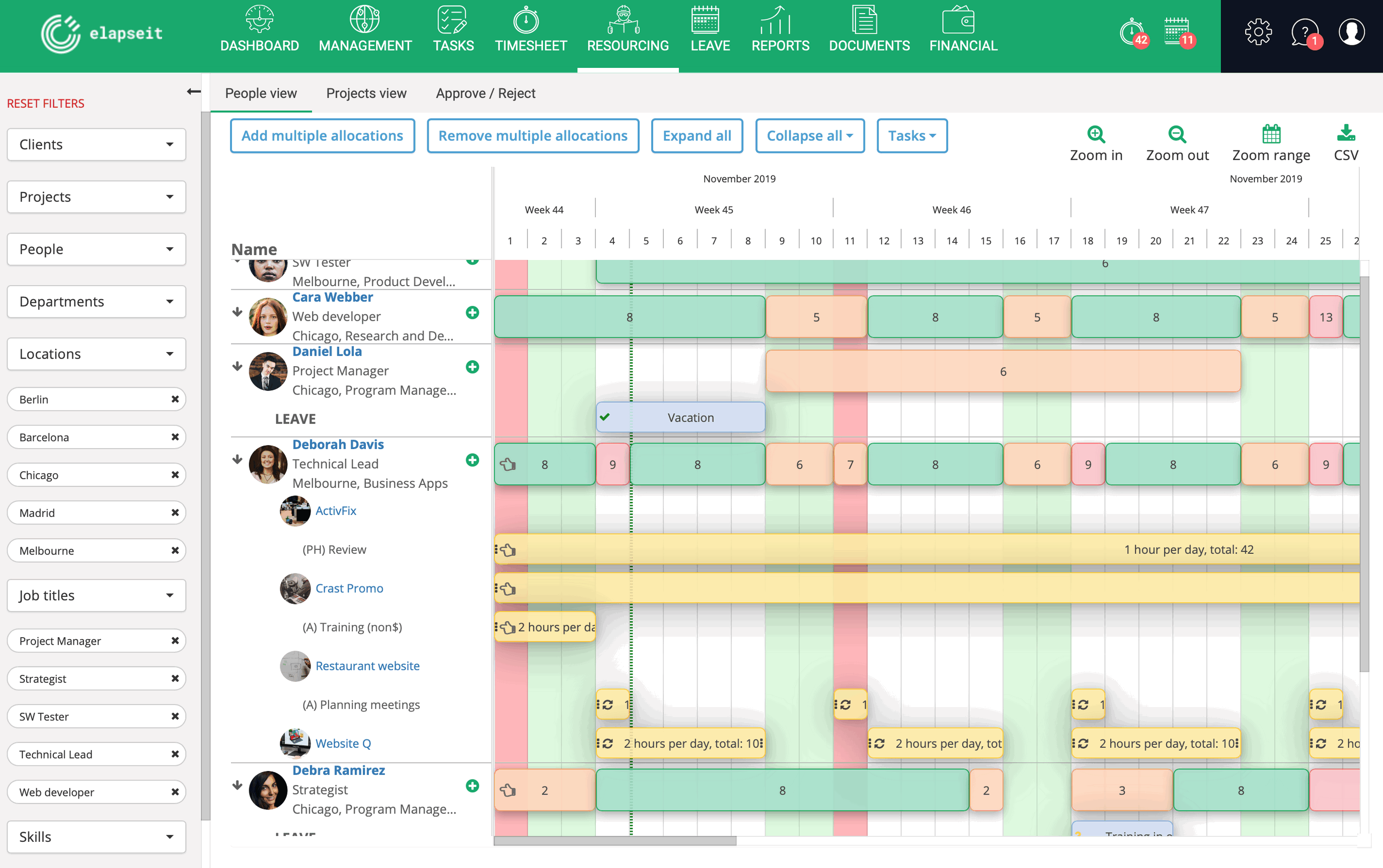 Vizualizați rapid programul și proiectele fiecărui membru al echipei. Minimizați conflictele și resursele subutilizate obținând o perspectivă mai bună asupra disponibilității echipei, pe termen lung sau scurt.