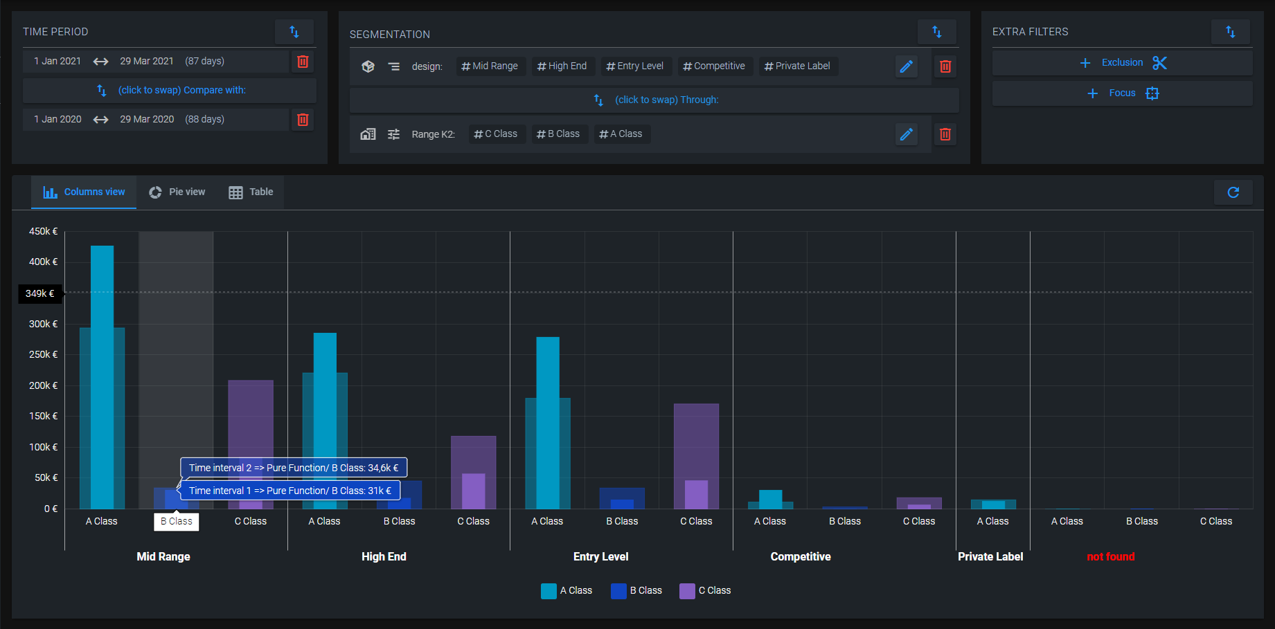Exemplu: evolutia comparativa a vanzarilor pe clientii segmentati pe metodologia ABC (Pareto), detaliata prin segmentarea produselor in functie de design