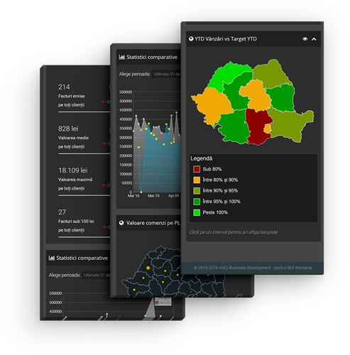 Business Intelligence nu înseamnă doar cifre. Alegem fiecare indicator vizual pentru a fi cât mai ușor de citit și mai sugestiv. Acolo unde e nevoie digitalizăm hărți personalizate pe specificul pieței clientului.