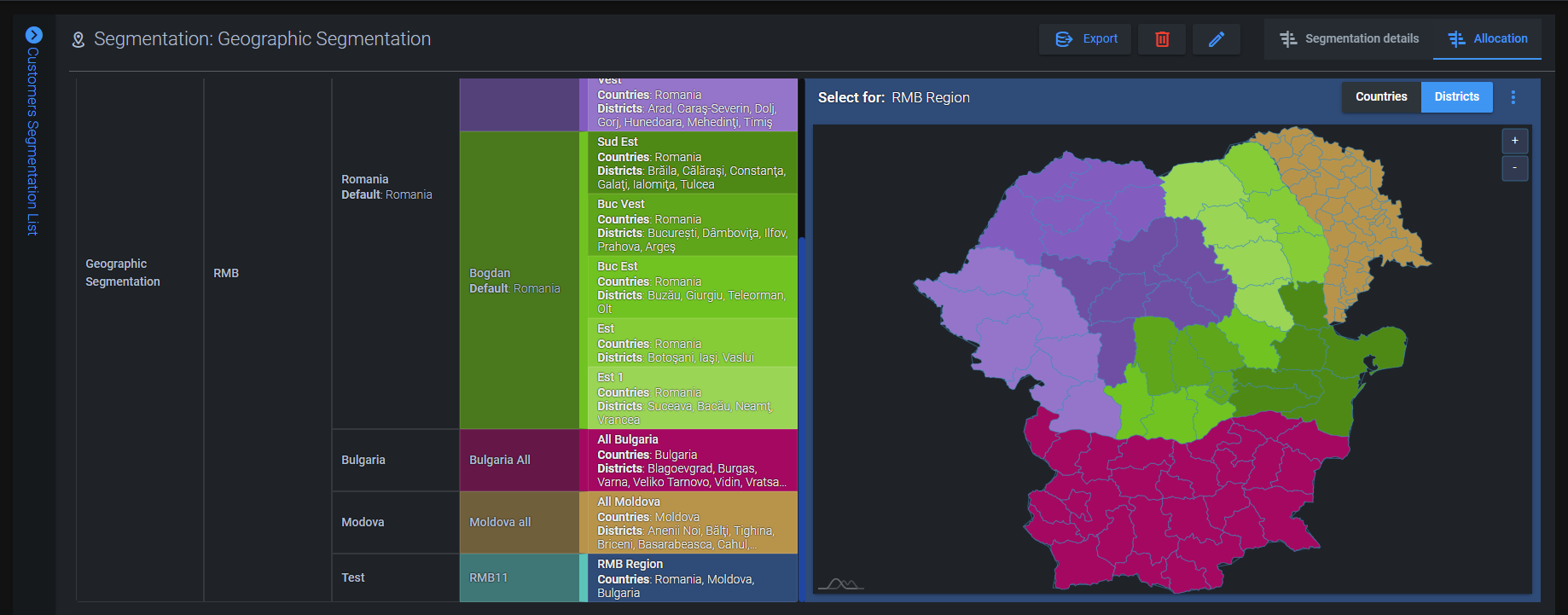 Aplicatia permite segmentarea clientilor in 4 modalitati:
