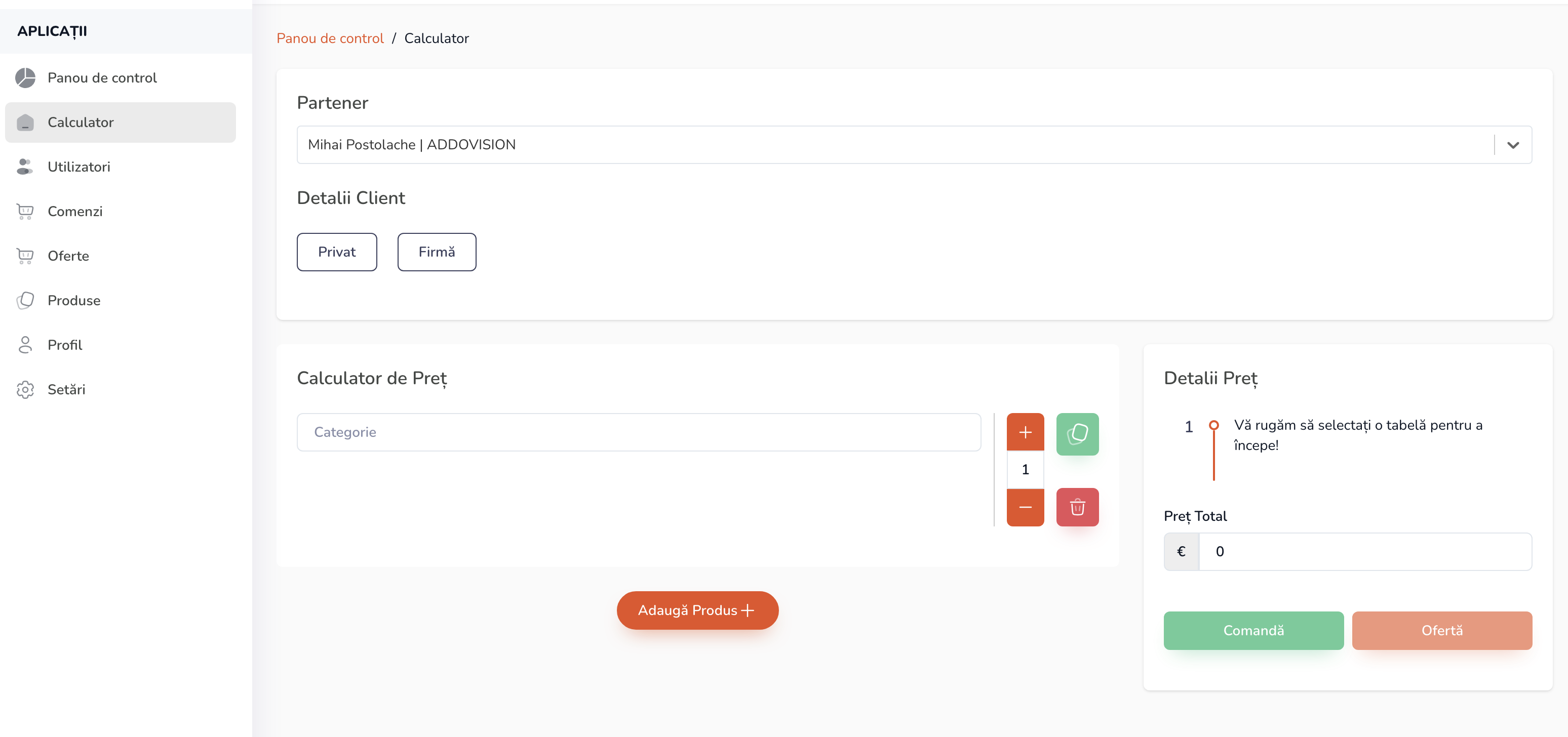 Ecranul de Calculator Complex de Preț pentru Produse Configurabile este o interfață intuitivă și puternică care permite utilizatorilor să configureze și să calculeze prețurile pentru produsele lor personalizate într-un mod simplu și eficient. Cu ajutorul acestui instrument avansat, utilizatorii pot să definească și să ajusteze o gamă largă de parametri, inclusiv caracteristicile produsului, materialele utilizate, dimensiunile, opțiunile de personalizare și multe altele.