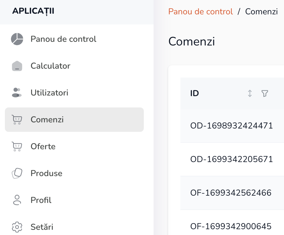 Interfața secțiunii de Comenzi este concepută pentru a fi intuitivă și ușor de utilizat, facilitând accesul rapid la toate funcționalitățile esențiale pentru gestionarea comenzilor. Utilizatorii pot să vizualizeze și să monitorizeze toate comenzile plasate, să urmărească statusul lor în timp real și să primească notificări și alerte pentru evenimentele cheie din procesul de comandare.