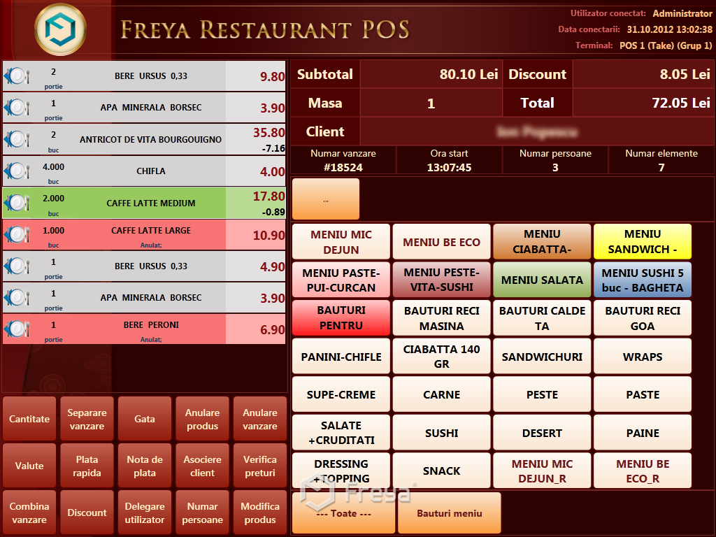 Dupa ce a primit comanda, chelnerul va merge la POS pentru a o marca in sistem. Un produs se poate anula daca ulterior a primit aceasta cerere de la client. Nota de plata din POS cuprinde subtotalul, discountul, clientul si masa, numarul vanzarii, ora, numarul de persoane de la masa si elementele care au fost comandate. In fereastra de vanzare, exista multiple optiuni ale ospatarului: separare vanzare, combina vanzare, adaugare vanzare, plata rapida, discount, anulare produs, anulare vanzare, modifica produs, deleaga utilizator si altele.