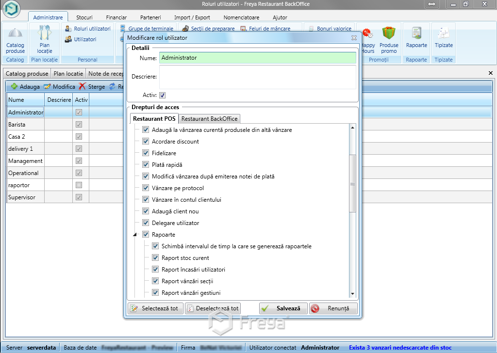 Fiecarui utilizator al sistemului i se va asigna drepturi in functie de responsabilitatile personale, accesul complet in back-office sau in orice alta parte a softului se va face numai daca utilizatorul are setat drepturile respective.