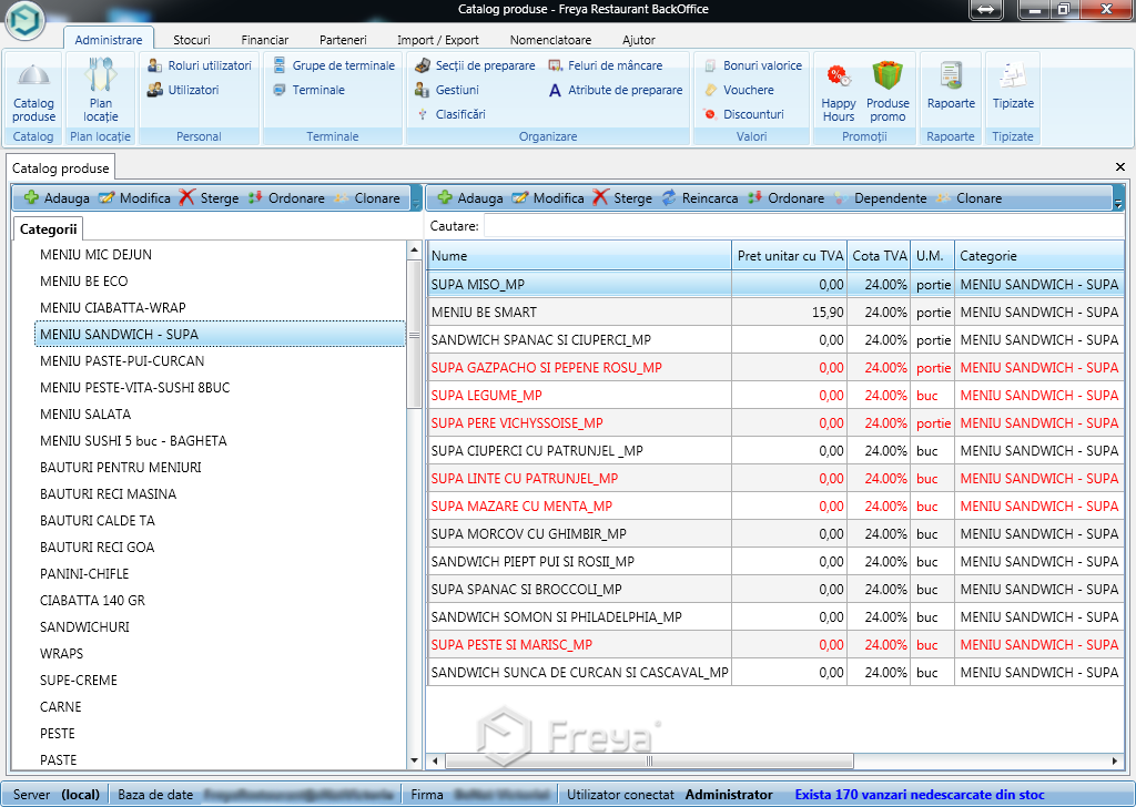 In partea de back-office a solutiei se poate accesa si adminsitra intregul meniul al locatiei prin intermediul catalogului de produse. Puteti adauga, sterge sau edita orice fel de meniu sau produs servit in restaurant.