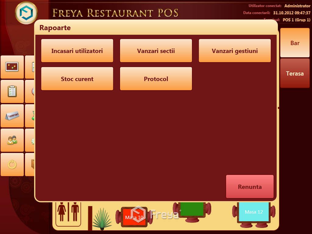 Planul locatiei - interfata din POS pe care o vede ospatarul atunci cand intra in aplicatia Freya Restaurant. Mesele si planul locatiei pot fi schimbate in functie de realitatea planului locatiei. Freya Restaurant are o intervata extrem de intuitiva pentru utilizatori.