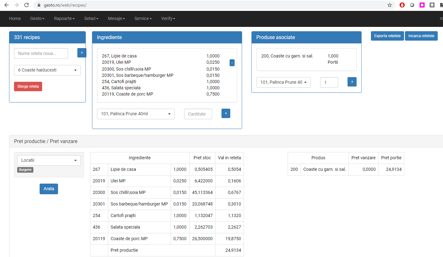 - definirea retetelor de producţie pe bucata sau pe portii