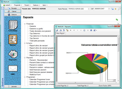 Prin numărul mare de rapoarte standard, precum şi prin calitatea de a configura orice tip de raport necesar, MedSoft oferă managerilor informaţii în timp real despre activitatea din clinică.