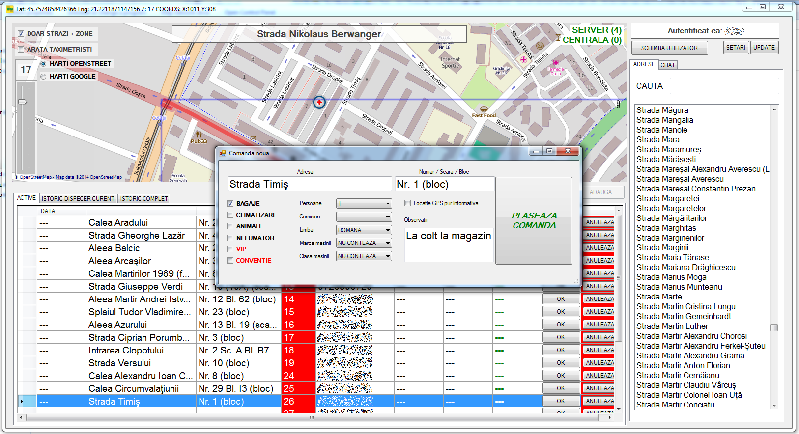După autentificarea operatorului într-un cont dedicat, la intrarea în tură, modulul dedicate dispeceratului;