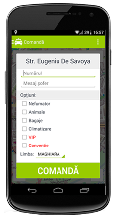 1.Printr-un simplu click clientul își selectează poziția exactă pe hartă de unde dorește să fie preluat și are opțiunea de a completa un formular pentru a filtra taxiul dorit (sofer si masina):