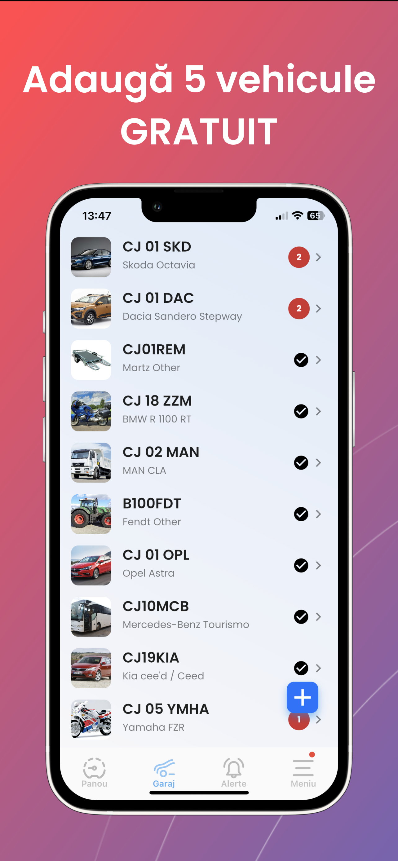 Gestionează și monitorizează gratis: RCA, Rovinieta, ITP, CASCO, daune și mentenanța pentru orice vehicul: mașină, remorcă, furgonetă, motocicletă, ATV, camion, tractor, autobuz.