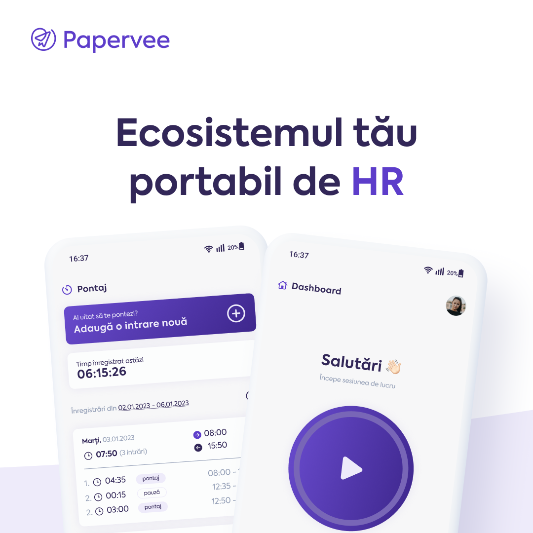 Simplifică și digitalizează fluxurile de HR în compania ta și ajută echipa să se concentreze pe proiectele care chiar contează cu Papervee. Economisești timp pe care apoi îl vei putea folosi în proiectele care contează. Scapă de metodele tradiționale de HR. Platforma este disponibilă și în format de aplicație pentru Android, iOS și HarmonyOS (Huawei).