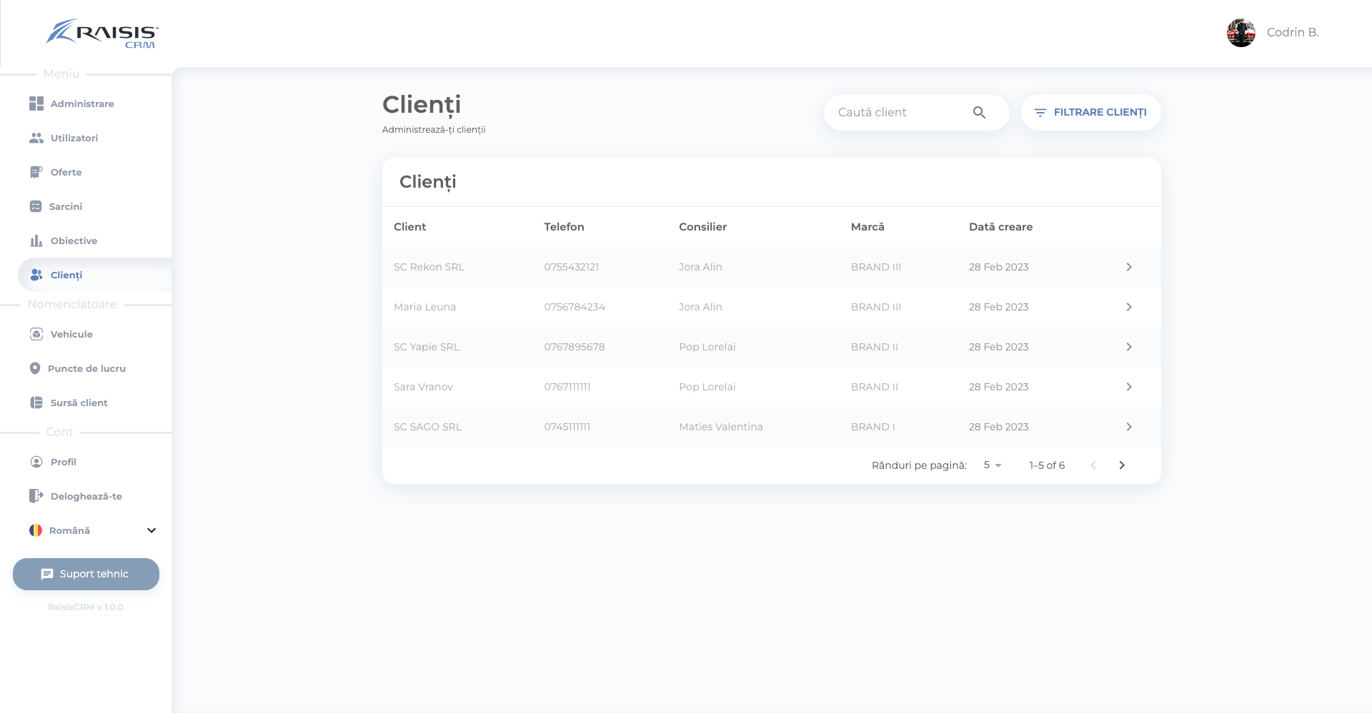 Sistemul de gestiune a clienților - este unul dintre cele mai importante sisteme din cadrul platformei, pentru că abordează necesitățile și procesele legate de unitatea de bază afacerii. Acesta permite utilizatorilor să introducă clienți noi și să îi modifice pe cei actuali în funcție de necesități. Portofoliul de clienți va fi bine organizat, pentru că sistemul permite organizarea unui client în funcție de un consilier, dar și de mărcile de autovehicule ce sunt de interes pentru un client. În plus, având o interfață modernă și orientată către utilizator, acest sistem v-a oferi și posibilitatea de interoga baza de date pentru a facilita căutarea, crearea, editarea și gestionarea unui client. Având în minte și măsurile legale în vigoare în legătură cu informațiile cu caracter personal (GDPR), sistemul vine cu automatizarea de a îi reaminti utilizatorului de a semna și încărca un acord GDPR pentru fiecare client introdus. În plus acesta ține cont și de data de expirare a unui asemenea acord GDPR. Pentru a facilita gestionarea unui client, în cadrul sistemului, entitatea clientului ține toate comenzile și ofertele acestuia, facilitând satisfacerea necesităților lui.