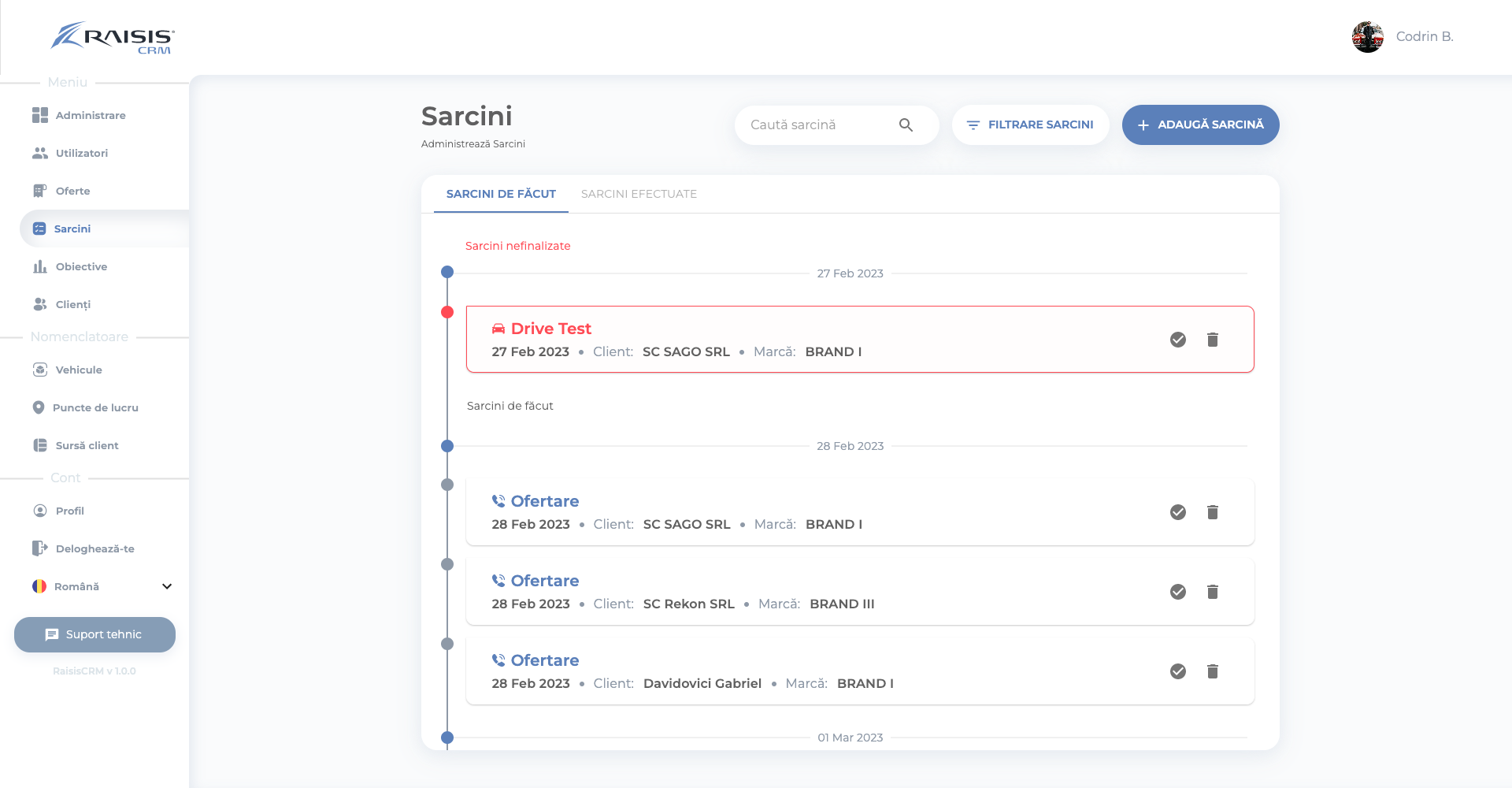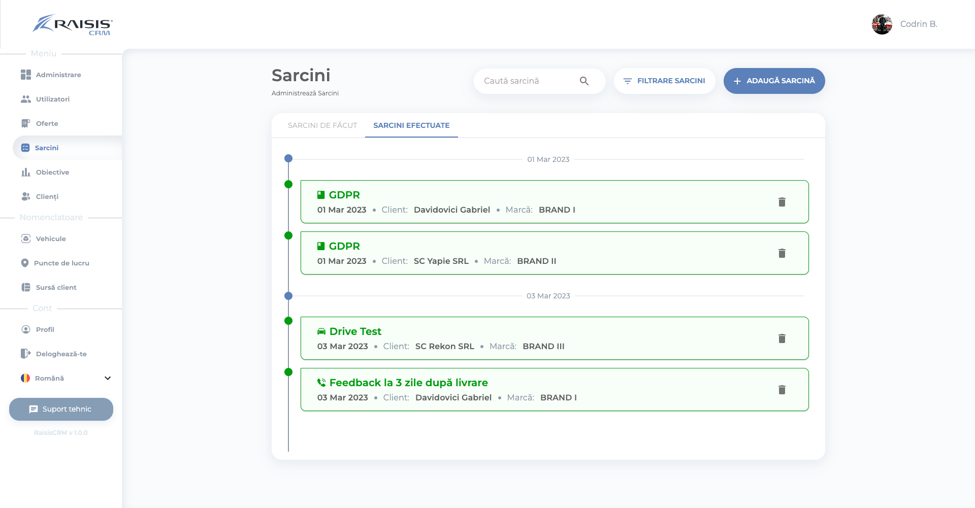 Sistemul de task-uri per client - este un sistem robust, simplu și intuitiv, ce oferă un grad mare de organizare a oricărei sarcini legate de un client. Acesta are la bază o interacțiune de tip TO-DO permițând crearea de către un utilizator a unei sarcini ce trebuie efectuată pentru acel client. Fiecare sarcină are un termen limită stabilit de utilizator și sistemul trimite în mod automat notificare utilizatorului până la efectuarea acelei sarcini. Aplicând standarde moderne, sistemul filtrează și organizează sarcinile per client în funcție de urgența fiecăruia.