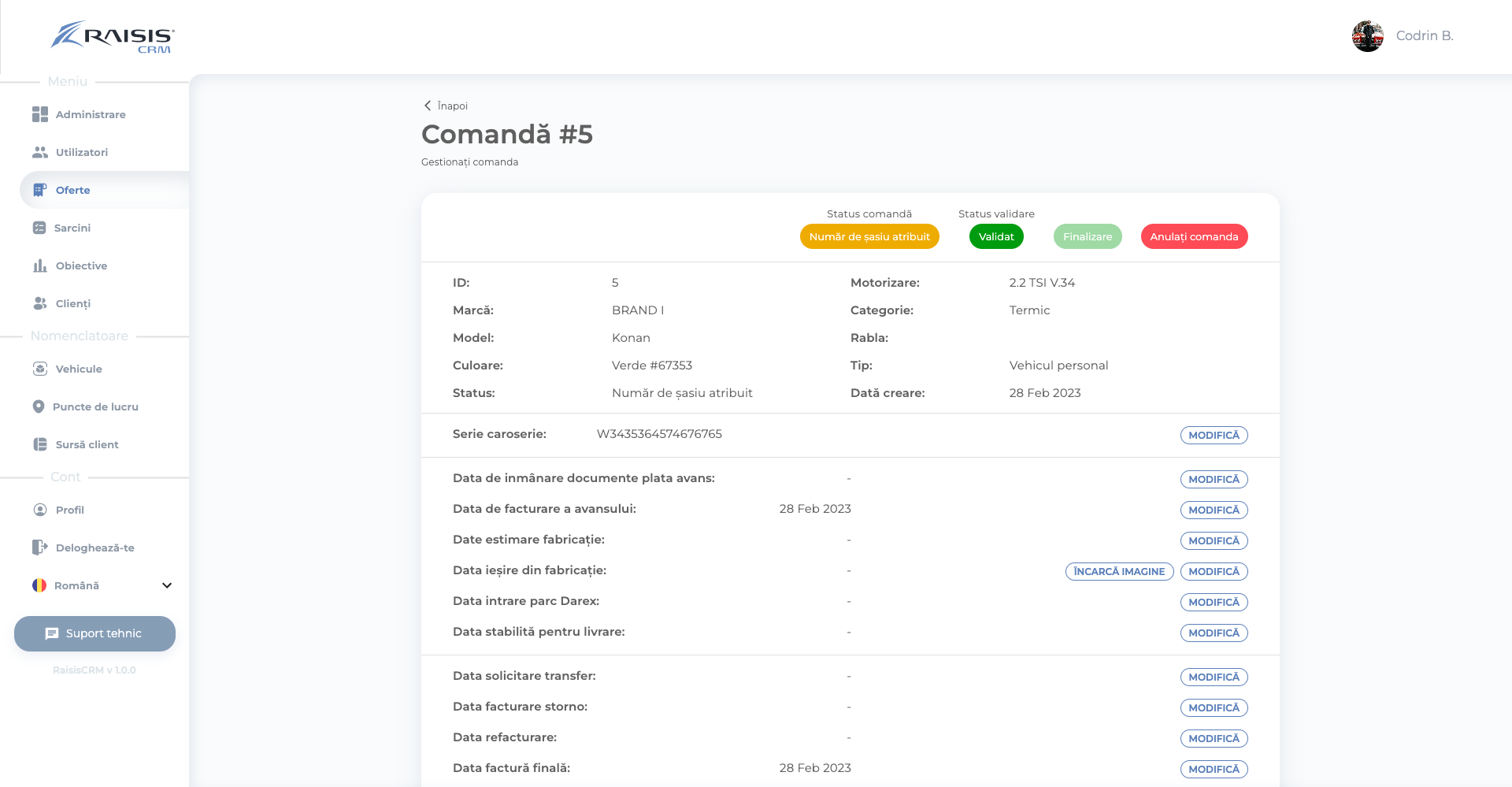 Sistemul de comenzi - sistemul de comenzi beneficiază de un întreg șir de automatizări, ce pleacă de la acceptarea unei oferte, ce transformă toate vehiculele cuprinse în comenzi separate. Fiecare comandă poate fi verificată de utilizatori special desemnați, poate ține documente necesare ei, dar cel mai important, are un sistem de gestiune simplu, dar robust, ce conține toate informațiile necesare unei comenzi. Aceste informații se referă de la seria șasiului, până la datele de livrare a autovehiculului. În plus, stadiile comenzii facilitează gestiunea ei pe toată durata, dar și foarte important, acestea sunt niște triggere pentru modificarea obiectivelor fiecărui angajat în mod automat de către sistem.