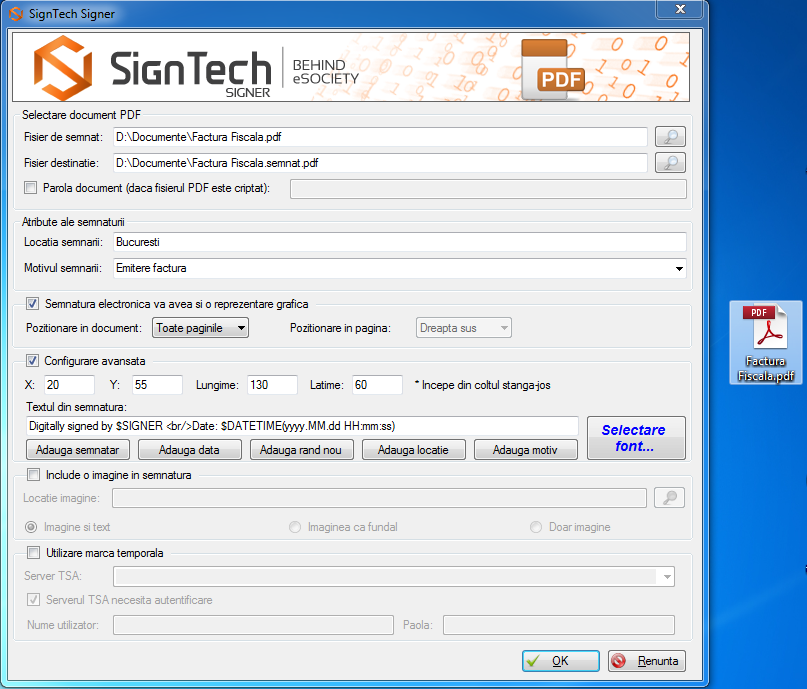 Puteti urmari toate detaliile legate de semnarea automata cu Sign Tech Signer: selectarea documentului de semnat si fisierul de destinatie, optiunea ca semnatura electronica sa aiba si o reprezentare grafica, configurari avansate si alegerea textului pentru semnatura. Exista si optiunea de a adauga o marca temporala.