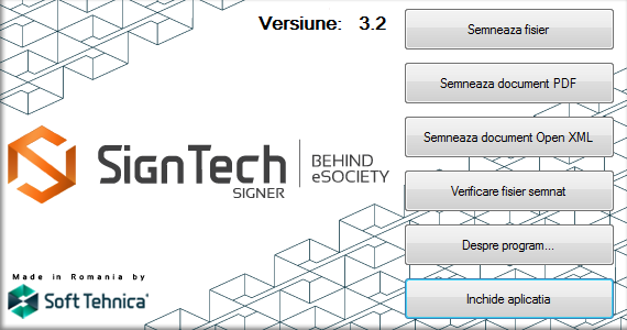 Cu ajutorul solutiei Sign Tech, puteti semna electronic fisierele, documentele PDF, documentele Open XML, puteti verifica fisierele semnate sau puteti afla mai multe despre program. Sign Tech semneaza automat documentele, conform cadrelor legislative in vigoare.