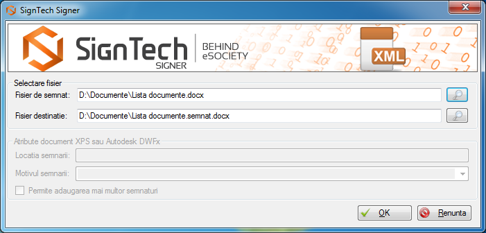 Cu ajutorul acestei optiuni, veti putea selecta manual fisierul de semnat, precum si fisierul de destinatie, printr-un simplu Browse in folderele dumneavoastra de documente. Astfel, semnarea automata va fi simpla si sigura.