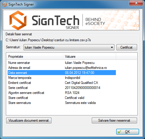 In cazul in care exista mai multe semnaturi automate disponibile, veti putea alege dintre acestea semnatura dorita. Solutia inregistreaza numele, adresa de email, data semnarii, marca temporala (daca este cazul), emitentul certificatului, algoritmul semnarii certificatului, starea certificatului si starea semnaturii.