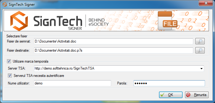 Documentele pot fi semnate electronic folosind un certificat electronic calificat, dar pot fi si marcate temporar prin autentificare la serverul TSA. Marcile temporale emise de catre Sign Tech TSA se pastreaza intr-o baza de date Microsoft SQL Server 2008 R2.