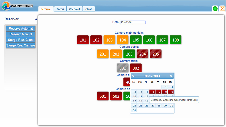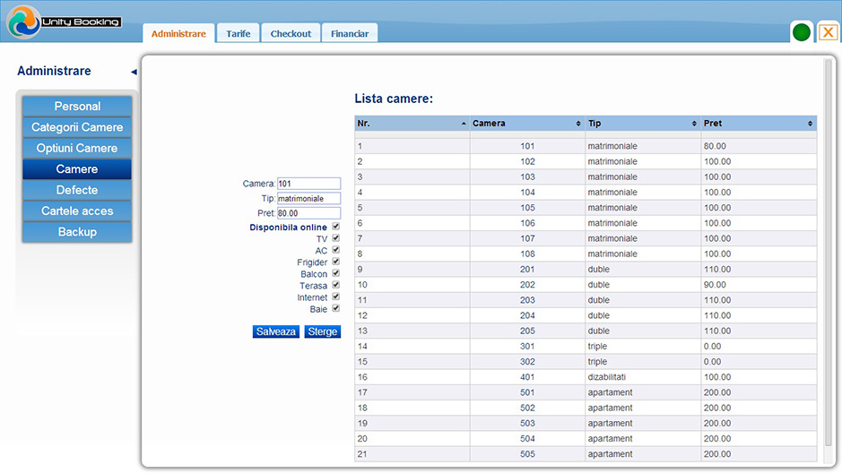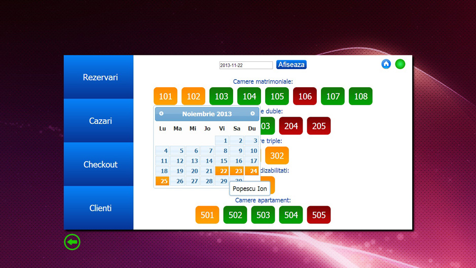 Aplicatia a fost dezvoltata pentru a oferi managerilor de Hotel, proprietarilor de Pensiuni si personalului acestora un mai bun control asupra rezervarilor in primul rand, dar si asupra altor componente din activitatea acestora. De asemenea, pentru a creste randamentul locatiei, am avut in vedere si sporirea confortului clientilor, prin crearea unor modalitati simple si rapide de efectuare a tuturor formalitatilor legate de sederea intr-un hotel sau pensiune. Preturi incepand de la 700,00 lei. Asiguram mentenanta in conditii avantajoase.