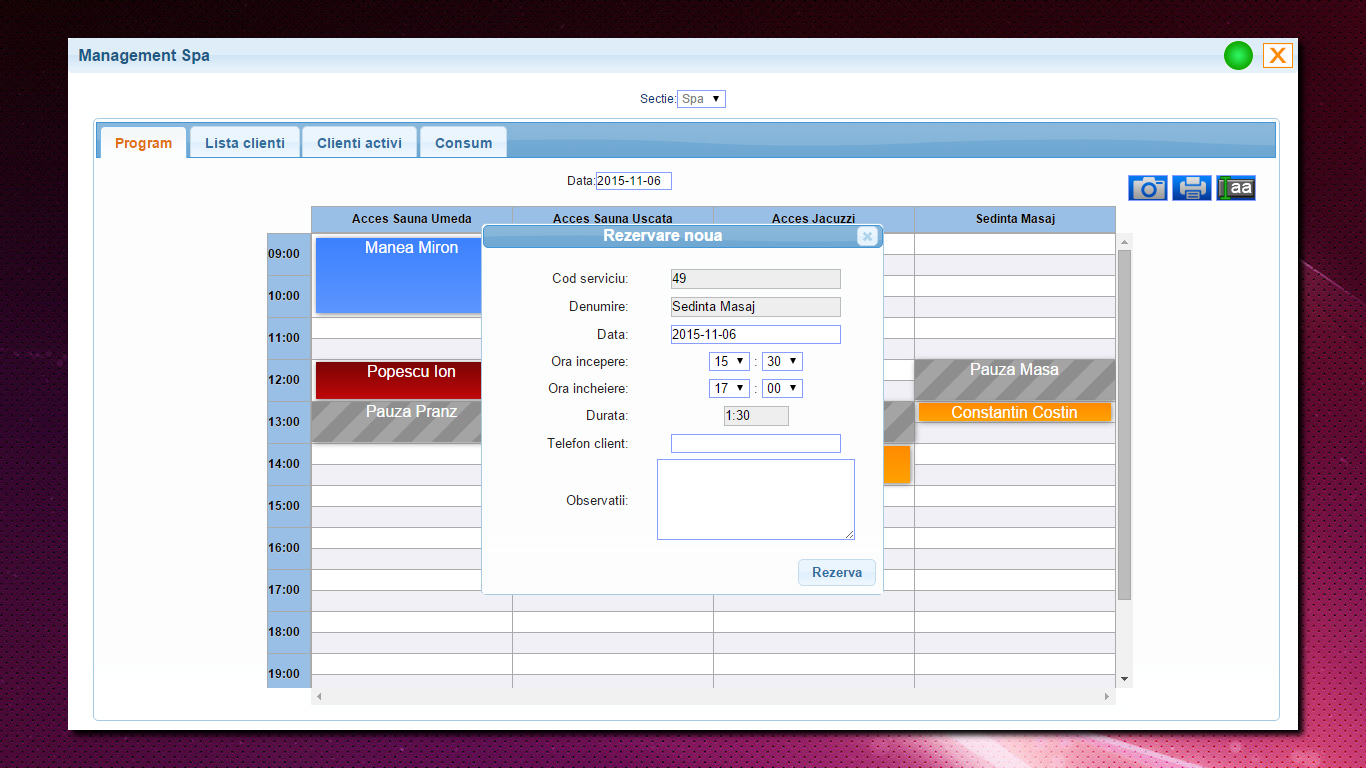 Modulul permite gestionarea rezervarilor si a clientilor, comunicand cu modulul de receptie pentru a facilita facturarea serviciilor si a produselor consumate.