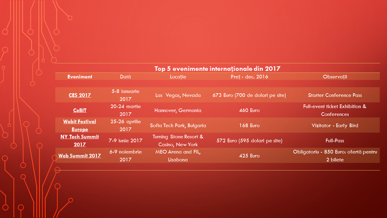 IoT, smart cities, smart homes, digital health, boți și roboți, soluțiile software de tip BI, ERP, CRM, dispozitivele mobile și wireless, trend-uri și insight-uri din industrie, sunt doar câteva dintre subiectele care vor fi abordate la cele mai importante evenimente internaționale, din domeniul tehnologic, în anul 2017: CES 2017, CeBIT, Webit Festival Europe, NY Tech Summit 2017 ș Web Summit 2017.