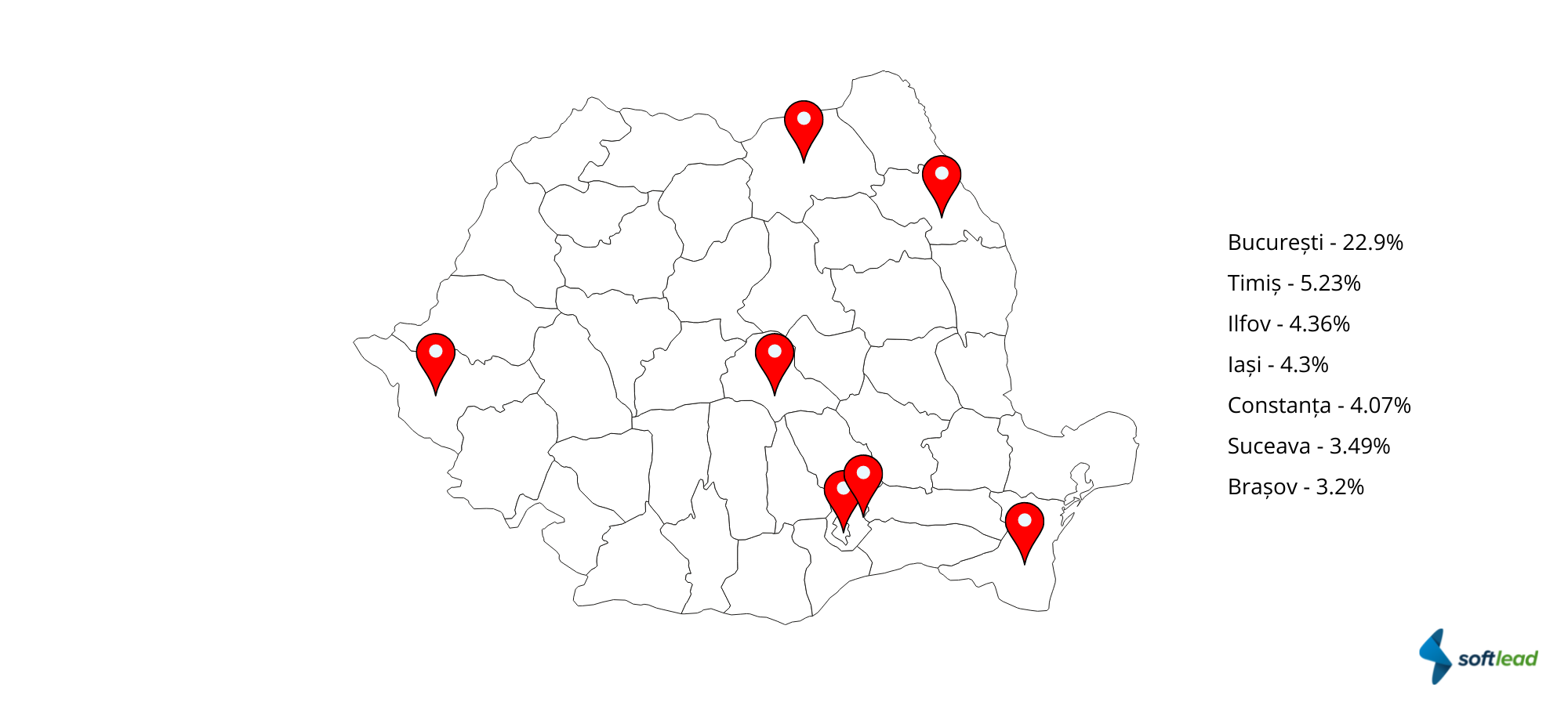 Deși digitalizarea nu are nici limite nici granițe de poziționare, conform datelor Softlead, județele cu cel mai mare interes în transformarea digitală sunt București, Timiș, Ilfov, Iași, Constanța, Suceava și Brașov.