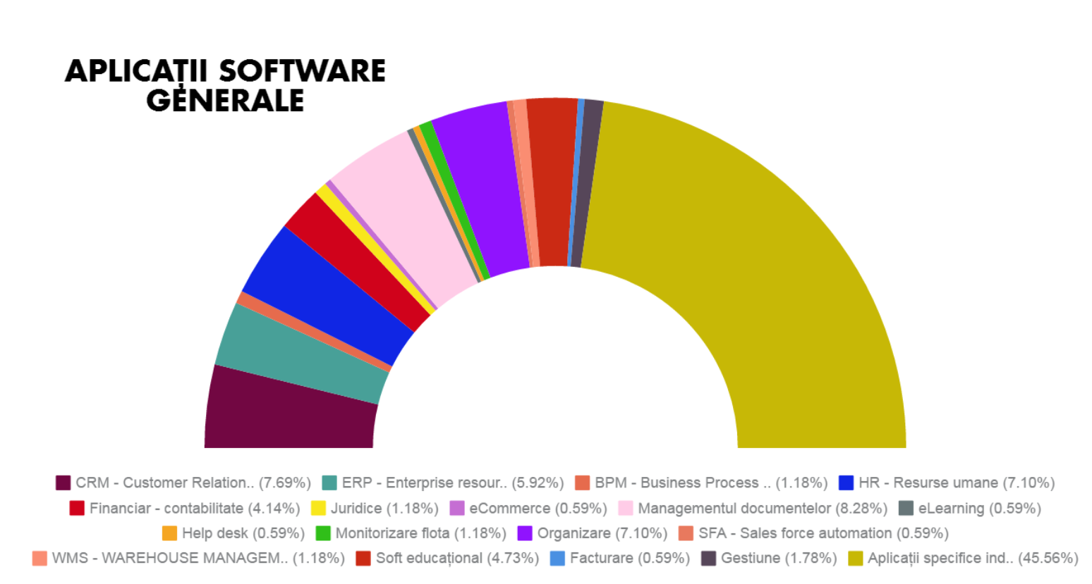 În primele 3 luni ale anului, cele mai multe lead-uri generate au fost cele pentru aplicațiile specifice (ERP – 5.92%, CRM – 7.69%, HR – 7.1%, BPM - 1.18%), cu implementare în special în domeniile medical, agricultură, retail sau construcții. Una dintre aplicațiile care s-a menținut în topul nevoilor celor mai multe dintre companii este cea dedicată Managementului documentelor (8.28%), fiind urmată de organizare (7.1%) și de cele specifice activităților financiar-contabile (4.14%).
