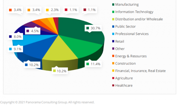 Conform unui raport anual realizat de PANORAMA CONSULTING GROUP pentru anul 2020, pe prima poziție a industriilor ce utilizează o astfel de soluție se află detașat, cu un procent de 30.7% - industria producătoare. Pe următoarele locuri, cu o distanță de aproximativ 20%, se poziționează industriile IT, Distribuție, Sector Public, Serviciile Profesionale și Retail.