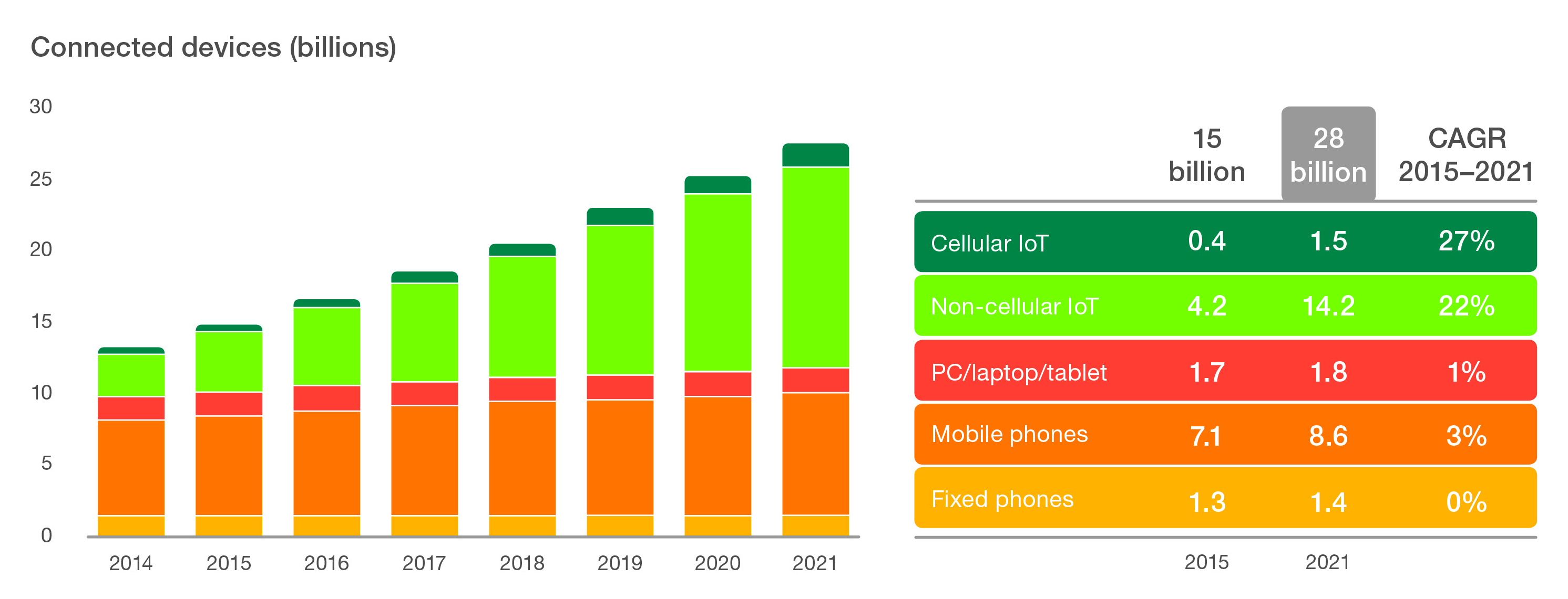 • Între 2015 și 2021, numărul de dispozitive conectate la IoT va crește cu 23% de la an la an. Dintre cele 28 de miliarde de dispozitive ce vor fi conectate până în 2021, aproape 16 miliarde vor fi dispozitive IoT. Europa de Vest va fi prima care va adopta conexiunile IoT și se estimează că numărul de dispozitive IoT de pe această piață va crește cu 400% până în 2021.
