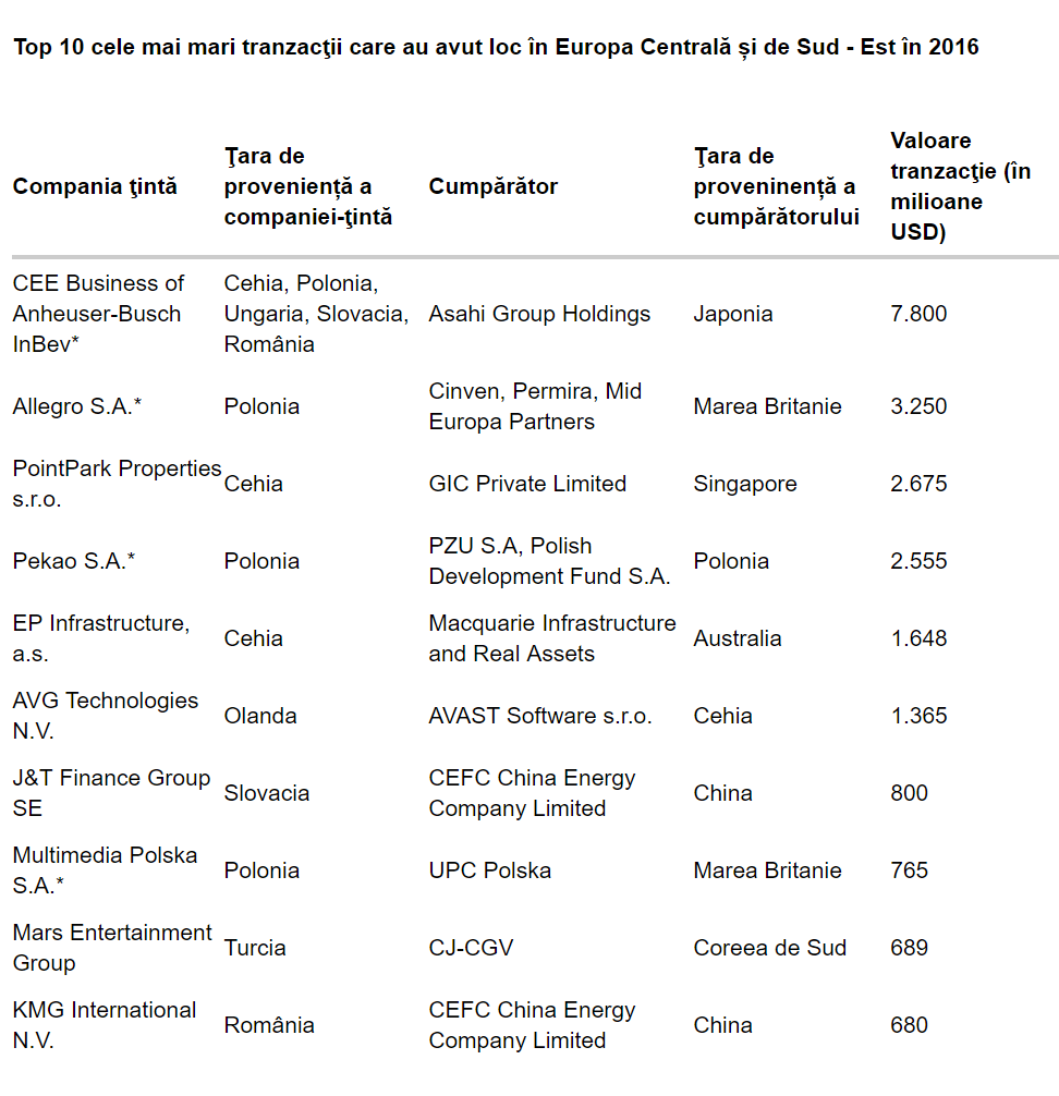 „Anul 2016 a adus tranzacţii importante în România şi în regiune, arătând un nivel de încredere din ce în ce mai ridicat al investitorilor globali. Numai cele două tranzacţii mari transfrontaliere, vânzarea SABMiller România către Asahi şi vânzarea pachetului majoritar la KMG International (Rompetrol în România) către CEFC China Energy au depăşit 1 miliard de euro în valoare pe piaţa locală.