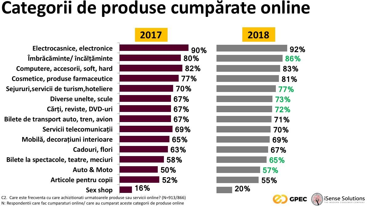 Printre categoriile de produse cu cea mai mare creștere față de 2017 se numără îmbrăcămintea (86% în 2018 față de 80% 2017), serviciile de turism și hoteliere (77% față de 70%), bilete la spectacole & teatru (65% față de 58%) și auto & moto (57% față de 50%).