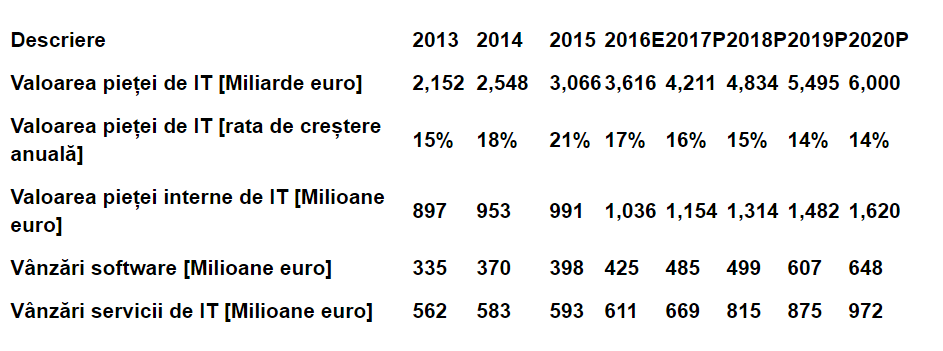 Serviciile de IT – Se estimează că piața internă a serviciilor de IT va crește de la 593 milioane euro în 2016 la 972 milioane euro în 2020, ceea ce corespunde unui CAGR de 8,5%. Soluțiile de cloud și adoptarea outsourcing-ului de către companiile locale vor genera extinderea segmentului serviciilor, care va completa sursele consacrate de venituri cum sunt consultanța și integrarea sistemelor.