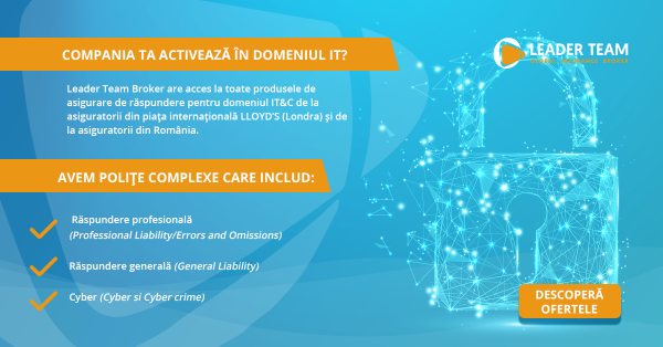 “Până acum companiile românești din domeniul IT&C erau nevoite să achiziționeze trei polițe distincte, de la furnizori diferiți – una de răspundere profesională, una de răspundere față de terți, iar alta de securitate cibernetică. Acum, pentru că aceste riscuri sunt acoperite de aceeași poliță, aceste companii salvează aproximativ 50% din prețul cumulat plătit”, explică Alexandra Durbacă, Director Executiv al Leader Team Broker.