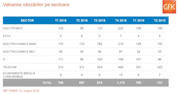 La nivelul întregii piețe, rezultatele trimestrului al doilea sunt pozitive, cu un avans de aproape 6%, până la 737 de milioane de euro. Cel mai mare sector al pieței, cel de telecom, a avut un avans de aproape 4%, atingând valoarea de 322 milioane de euro. Electrocasnicele mari și mici au avut performanțe bune, ca și în trimestrele anterioare, de peste 16% pentru fiecare sector, cu valori absolute de 155 si, respectiv, 53 de milioane de euro.