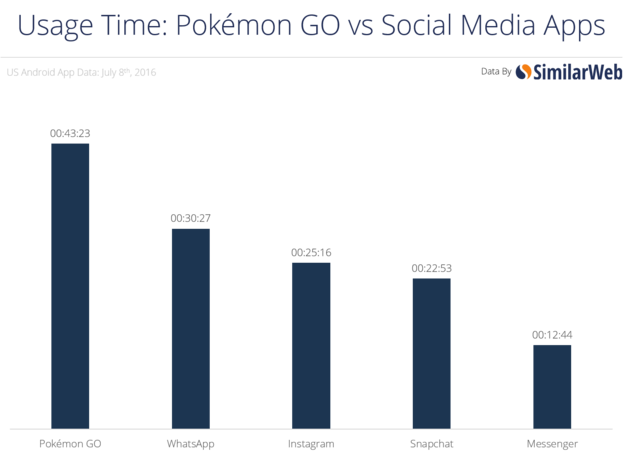 Pokémon Go a depășit aplicațiile de socializare precum: Instagram, Snapchat sau WhatsApp în ceea ce privește timpul petrecut de utilizatori în aplicație.