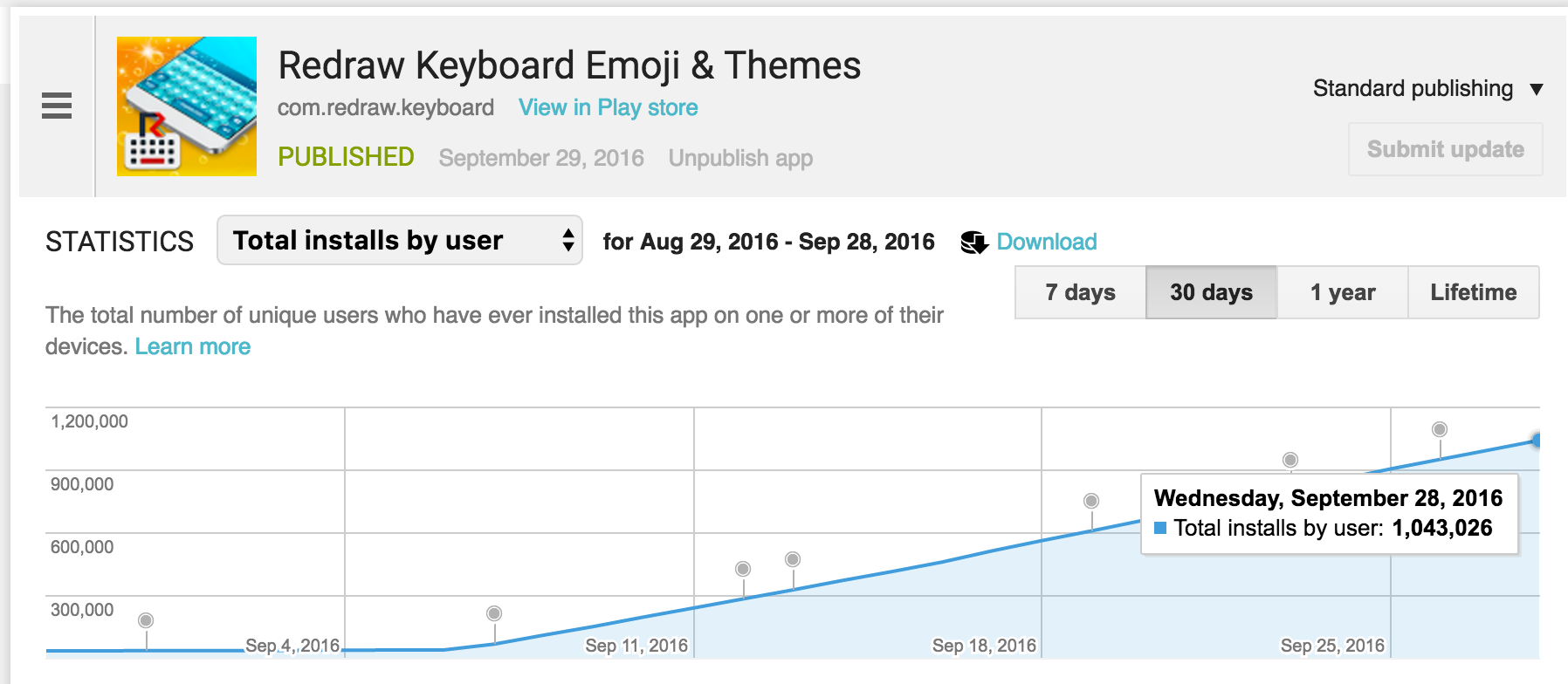 Pe 28 septembrie, cu 10 zile înainte de împlinirea primei luni pe app store-ul Google, Redraw Keyboard, o tastatură compatibilă cu toate modelele de telefon care rulează Android, a depășit pragul de un milion de instalări. Astfel, cursa către scopul #1M1M („un milion de useri într-o lună”) pe care și-l impunea echipa Redraw Keyboard la lansare, a fost câștigată.