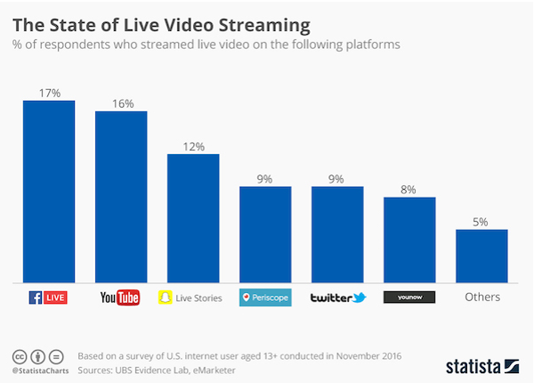 • Facebook Live este cea mai populară aplicație de live-steaming a momentului, numărul său de utilizatori depășind Youtube și chiar Periscope, respectiv prima companie care a adus conceptul în atenția publicului. Ultimele cifre publicate în cadrul Statista, arată că, în iunie 2016, peste 1.9 milioane de utilizatori au postat conținut video live prin intermediul rețelei.