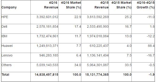 La nivelul companiilor, gigantul HPE (Hewlett Packard Enterprise) s-a poziționat pe primul loc pe piața furnizorilor de servere având, numai în ultimul trimestru din 2016, o creștere de 3.4 miliarde de dolari, cu o cotă de piață de 22.9% la nivel mondial. În ceea ce privește livrările pentru servere, Dell se află în top, cu o evoluție de 6.5%, ocupând 19.1% din piață. Huawei s-a bucurat, de asemenea, de cea mai mare creștere la nivelul livrărilor în ultimul trimestru din 2016, cu 64% mai mult față de aceeași perioadă din anul precedent.