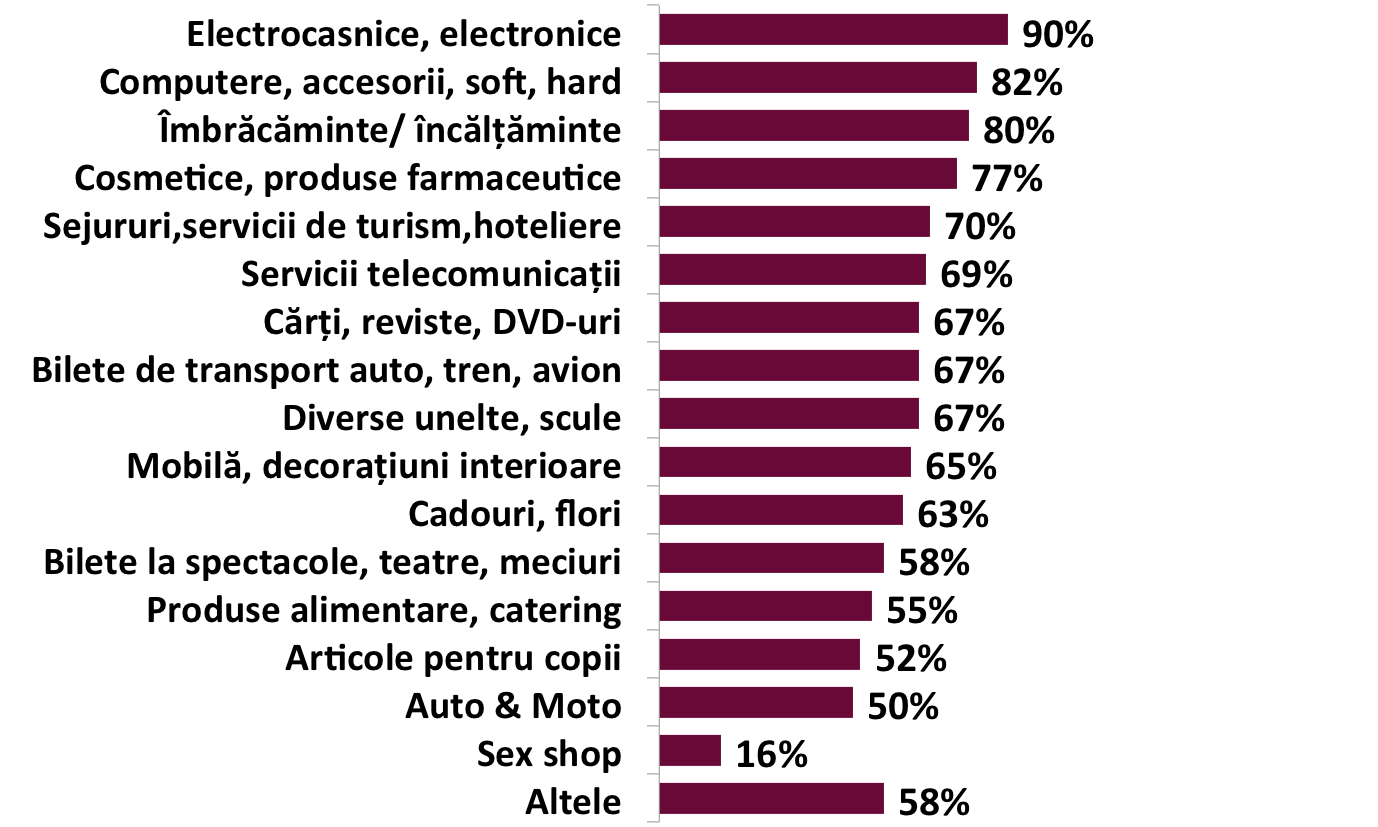 Cu o medie de 3 ori pe an, 90% dintre respondenții studiului preferă să achiziționeze din mediul online produse electronice și electrocasnice. Clasamentul continuă cu achiziția de computere, accesorii software și hardware (82%), îmbrăcăminte și încălțăminte (80%), cosmetice și produse farmaceutice (77%), sejururi și servicii de turism (70%), servicii în domeniul telecomunicațiilor (69%), cărți, reviste și DVD-uri (67%) sau produse alimentare și catering (55%).