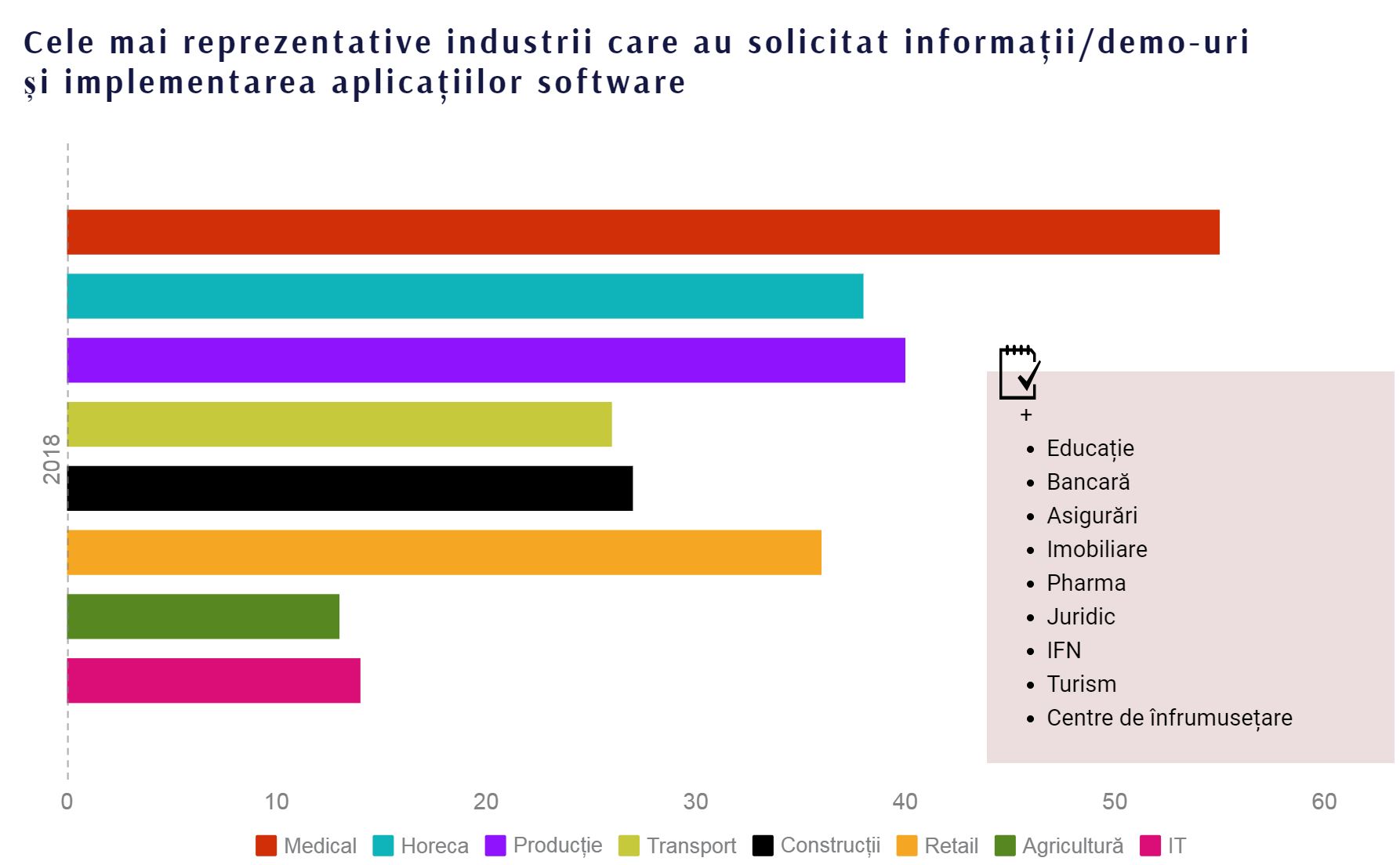 Industriile medical, producție, horeca și retail sunt cele mai importante segmente de piață care generează oportunități de implementare a tehnologiilor software. Pe locuri secundare se află construcțiile, transporturile, IT-ul și agricultura, dar au existat cerințe multiple și pentru industriile bancare, educaționale, asigurări, imobiliare, pharma, juridic, turism.